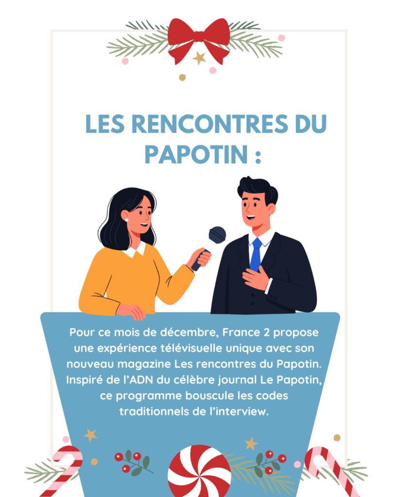 Pour ce mois de décembre, France 2 propose une expérience télévisuelle unique avec son nouveau magazine Les rencontres du Papotin. Inspiré de l’ADN du célèbre journal Le Papotin, ce programme bouscule les codes traditionnels de l’interview.
