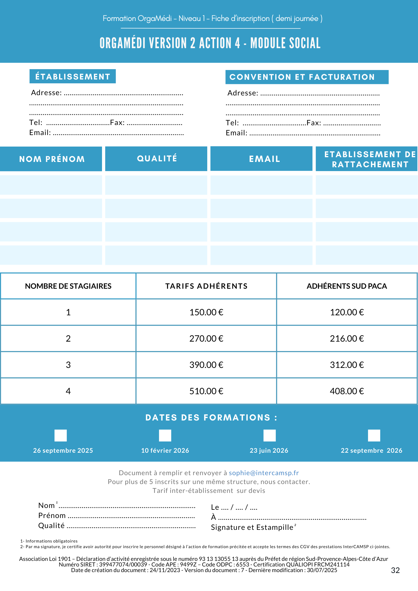 * Tarifs dégressifs à partir de la deuxième inscription/ -10% pour les adhérents PACA/ Devis sur site nous consulter